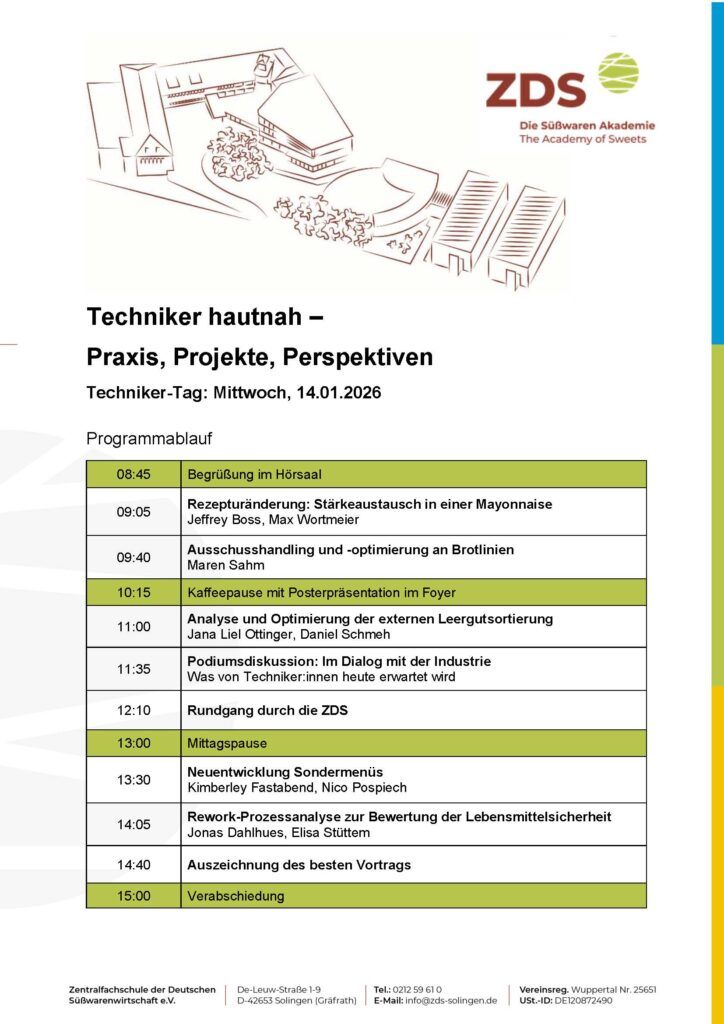 Nutzen Sie die Gelegenheit, hautnah zu erleben, wie vielfältig, praxisnah und zukunftsorientiert die Techniker-Weiterbildung an der ZDS ist. Unsere angehenden Techniker stellen ihre innovativen Projektarbeiten vor – und geben damit einen authentischen Einblick in die Inhalte, Anforderungen und Chancen des Bildungsgangs.